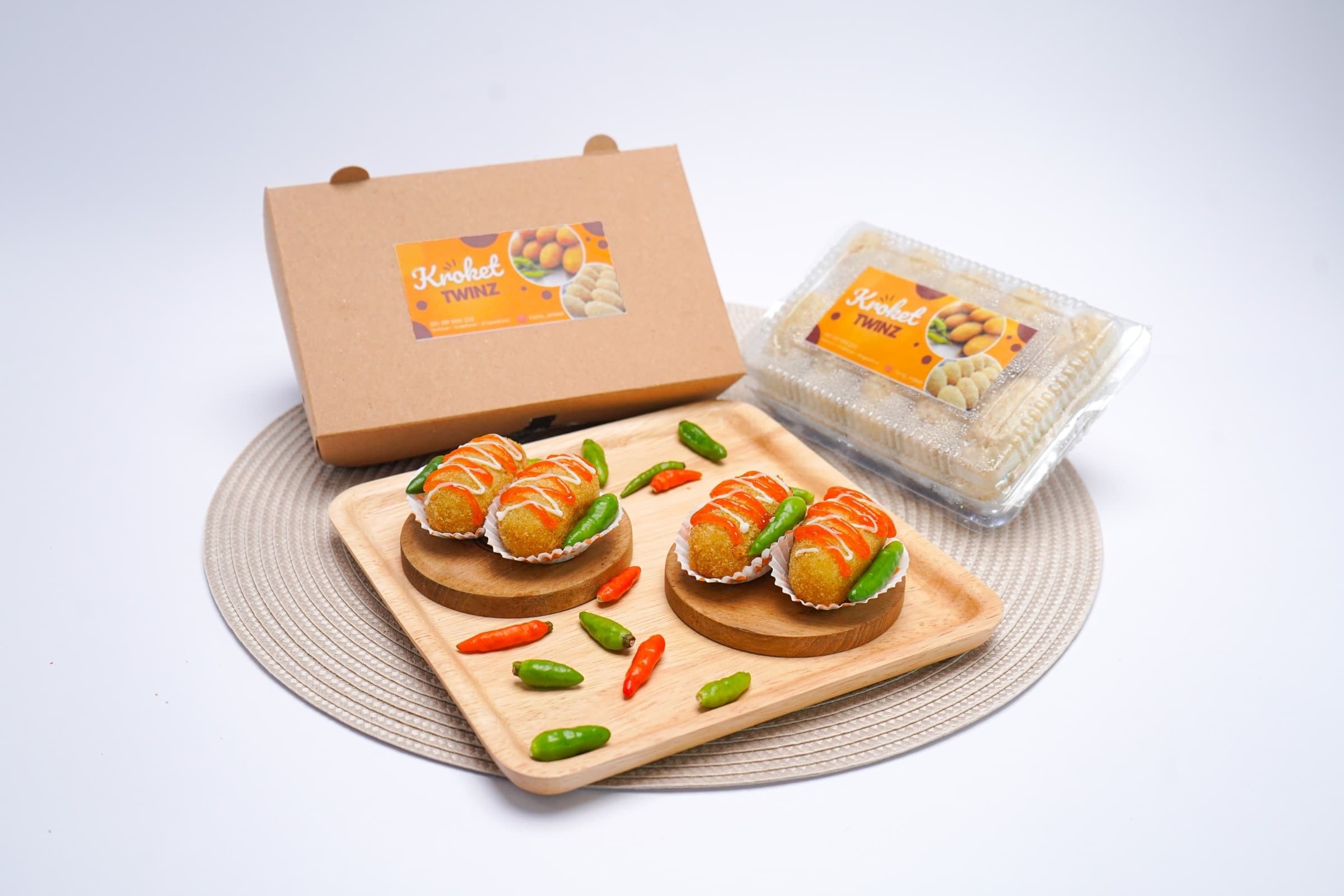Kroket ayam goreng dengan balutan tepung crispy dan topping saus sambal. Hadir dalam dua varian, siap makan untuk camilan langsung santap, dan versi frozen buat stok di rumah.